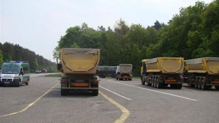 Inspektorzy z leszneńskiego oddziału Wielkopolskiego Wojewódzkiego Inspektoratu Transportu Drogowego przeprowadzili kontrolę pojazdów przewożących materiały na budowę nowej drogi w rejonie Rawicza. Stan ogumienia niektórych ciężarówek powodował poważne zagrożenie bezpieczeństwa.