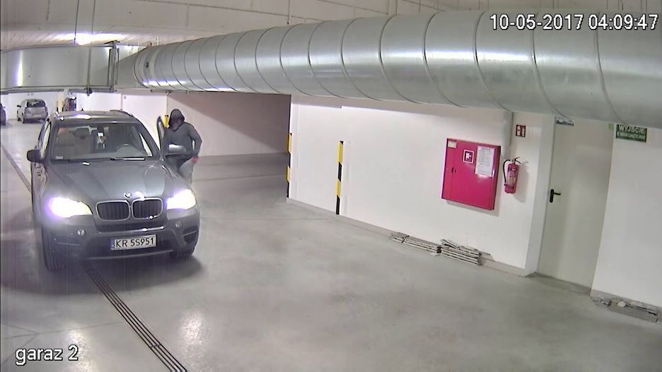 Na trwającym 20 minut nagraniu z kilku kamer dokładnie widać każdy szczegół dokonanej kradzieży BMW X5. Dwóch mężczyzn z zasłoniętymi twarzami wchodzi do budynku. Jeden z nich ubrany jest w dużą puchową kurtkę maskującą szczegóły sylwetki. Drugi z nich ma na sobie dresy. Obaj mają na dłoniach rękawiczki.