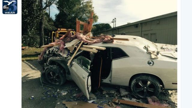 Zdemolowane dwa sklepy w centrum handlowym, wybite dziury w ścianach budynku i nadający się na złom Dodge Challenger to efekt podróży w czasie jakiej podjął się jeden z mieszkańców Pensacoli w USA.