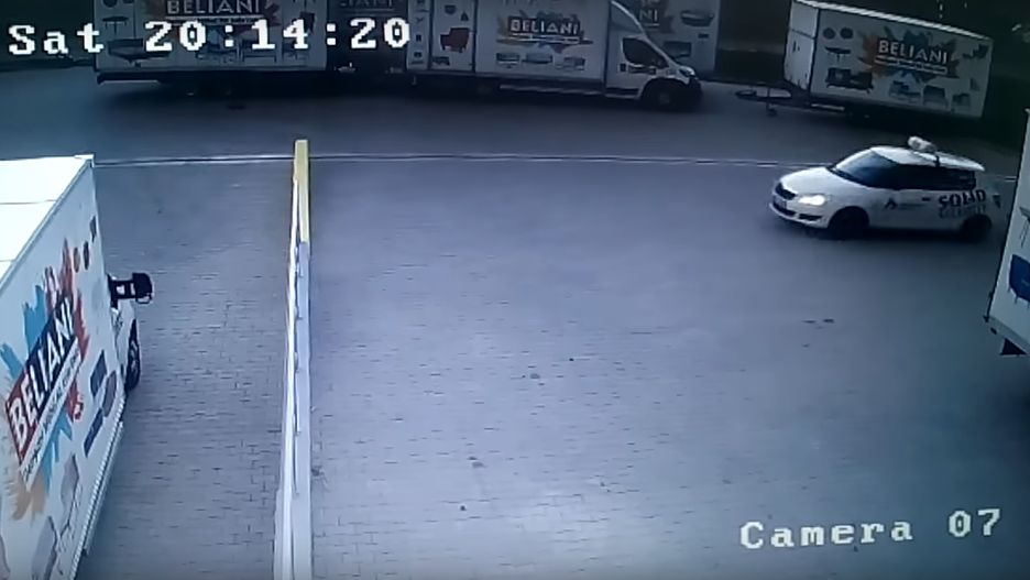 Na nagraniu widzimy ochroniarską Skodę Fabię, której kierowca prawdopodobnie wyrusza na interwencję. Wyjeżdża zza ciężarówki, nabiera prędkości. Niestety w ferworze walki nie zauważa wysokiego krawężnika i przelatuje przez niego. Nie wiemy jakim uszkodzeniom uległ samochód, ale wizyta w serwisie pewnie będzie konieczna.