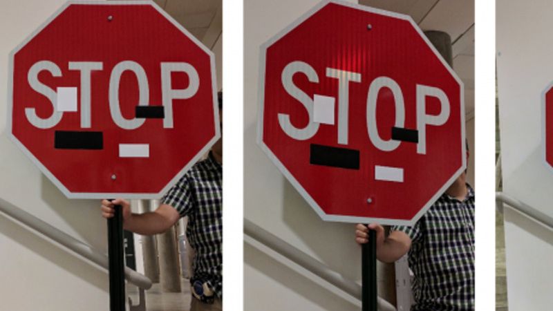 Badacze wzięli pod lupę sposób rozszyfrowywania znaków drogowych przez autonomiczne samochody. Odkryli, że przy użyciu specjalnych naklejek można całkowicie zmylić ich percepcję. Pierwszym przykładem błędnej analizy jest znak Stop, na który przyklejono naklejki z napisami "love" oraz "hate". Algorytm komputera na jego widok stwierdził, że jest to znak ograniczenia prędkości. Zatrzymaj się a zwolnij to jednak spora różnica, taki błąd mógłby doprowadzić do śmiertelnego wypadku.