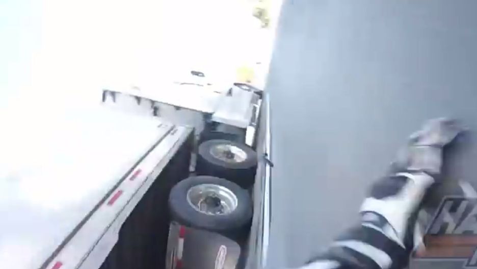 Film jest krótki i zaczyna się od momentu, w którym motocyklista ma shimmy, czyli bardzo trudny do opanowania rezonans motocykla. Po krótkiej walce z równowagą upada na jezdnię wprost pod koła wielkiej ciężarówki. Po długim "szlifie" po asfalcie okazuje się, że autor nagrania przeleciał pod pędzącą naczepą i prawie nic mu się nie stało.