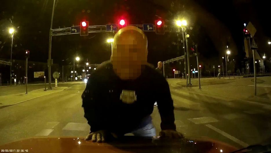 Bohater nagrania stanął przed skrzyżowaniem czekając na zielone światło. W pewnym momencie podbiegł w stronę jego samochodu mężczyzna i zaczął podnosić przód pojazdu.