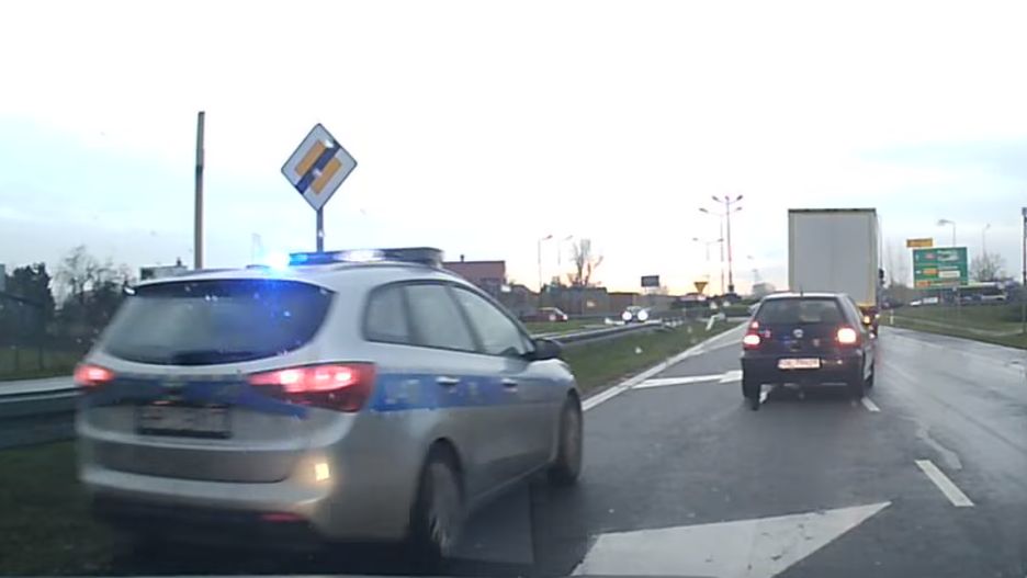 Chwilę później rozległ się odgłos syren policyjnych, a z lewej strony, po pasie zieleni, przejechał radiowóz. Ciężarówka momentalnie powróciła na swoje miejsce, ale samochód policji i tak zatrzymał się przy niej. Prawdopodobnie żeby nie tamować ruchu, funkcjonariusz kazał kierowcy zjechać na pobocze za rondem.