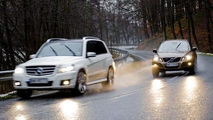 Teraz wiadomo, do czego w XC60 może przydać się ustawienie zawieszenia w trybie Advanced. Jednak możliwość zmniejszenia siły wspomagania (przez menu komputera samochodu) nie tłumaczy w wystarczającym stopniu języka, jakim koła próbują porozumieć się z kierowcą. Za kierownicą Volvo wciąż czuję się, jakbym kierował wózkiem na zakupy. Kiedy przesiadam się do GLK wartego sporo ponad 200 tysięcy zł, w zasadzie myślę tylko o tym, że samochód ma letnie opony. Droga wprawdzie jest czarna, ale na polach i w lesie leży śnieg. Temperatura waha się wokół zera. Zaczynam nieśmiało, lecz Mercedes inteligentnie modyfikuje nie tylko charakterystykę amortyzatorów, utwardzając je na łukach i stabilizując samochód, ale także z wyczuciem dobiera siłę wspomagania kierownicy. To szybko mnie ośmiela i mniej myślę o oponach, więcej o przyjemnym, bocznym przeciążeniu na kolejnym łuku. Podwójne wahacze przedniego zawieszenia pokazują, jaka jest ich